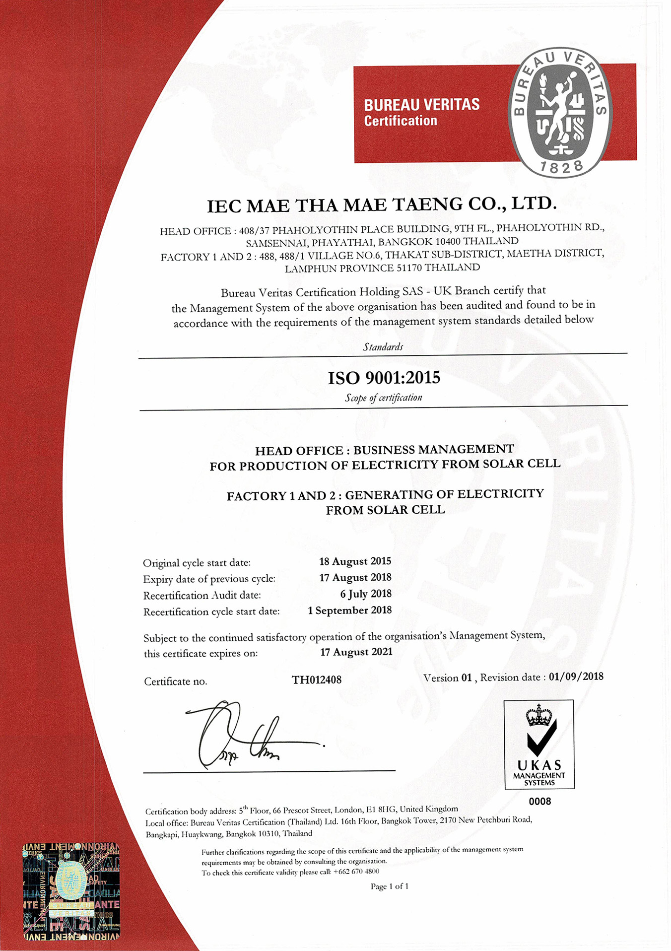 The solar power plant IEC Mae Tha Mae Tang ltd., Mae Tha district, Lamphun, a subsidiary of IEC plc. has been certified from Bureau Veritas Certificate (Thailand) Limited....